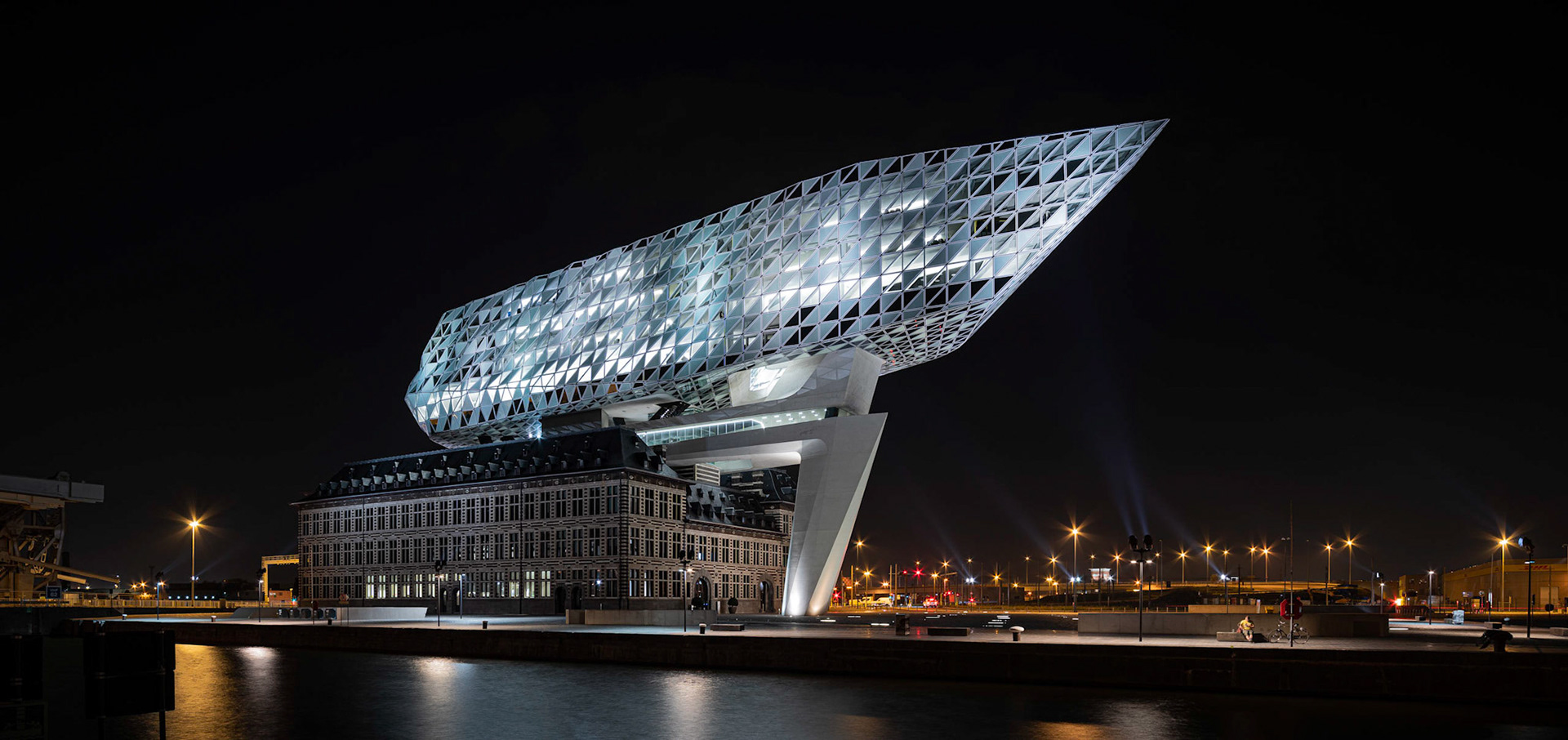 Het Havenhuis van Zaha Hadid (1950 - 2016) lijkt wel een ruimteschip.