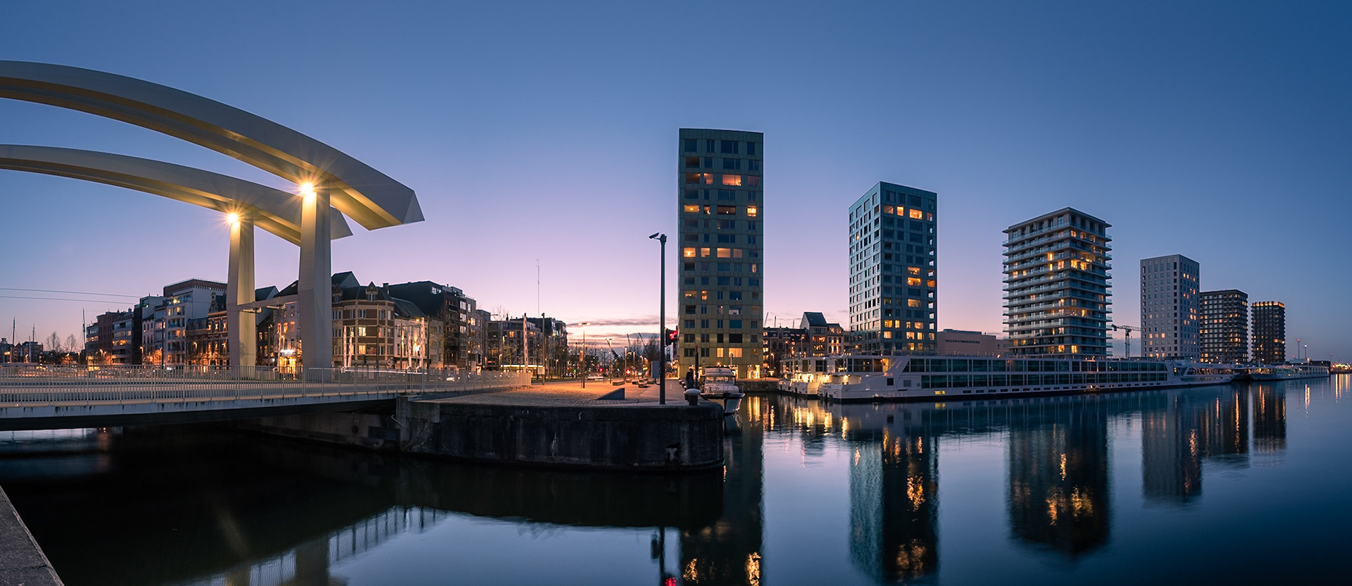 Scheldebocht bij zonsondergang / Scheldt bend at sunset. Links: 't Stad. Rechts: het begin van de haven / To the left: The City of Antwerp. To the right: the beginning of the Port of Antwerp.